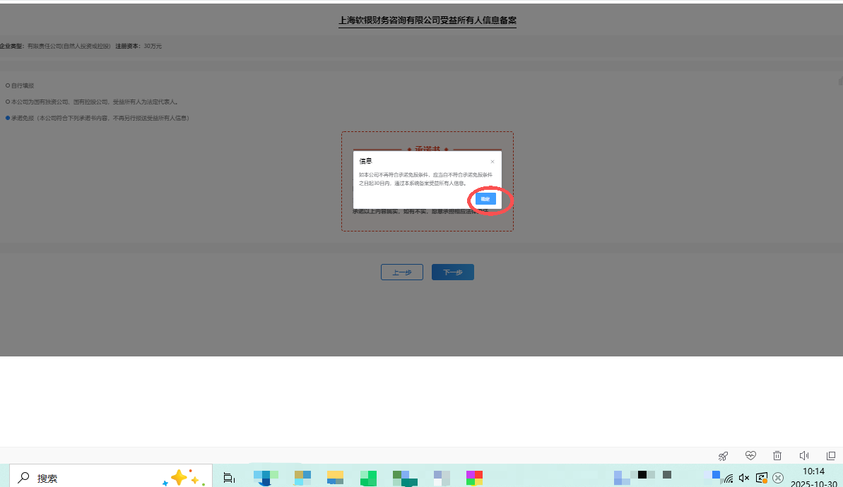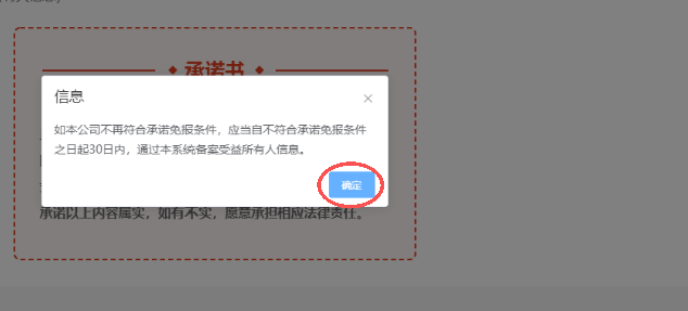 在點(diǎn)擊【承諾免報(bào)】-【下一步】后出現(xiàn)圖1的信息框,點(diǎn)擊信息框紅圈標(biāo)注的【確定】后,回到了下圖2,即表示申報(bào)成功。